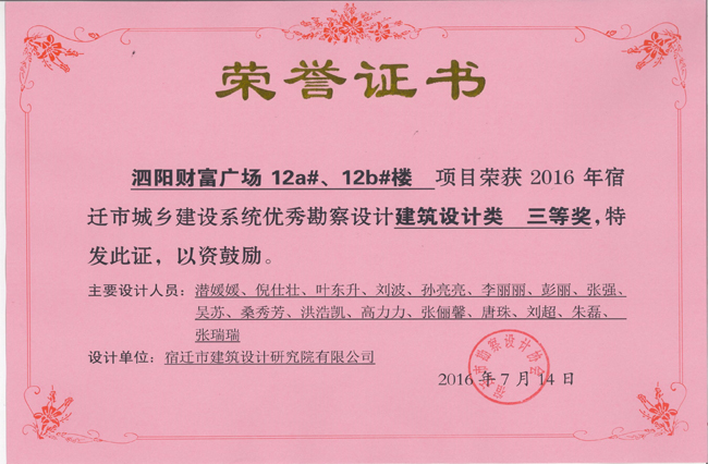 1、泗陽(yáng)財(cái)富廣場(chǎng)12a#、12b樓項(xiàng)目中獲建筑設(shè)計(jì)類三等獎(jiǎng)