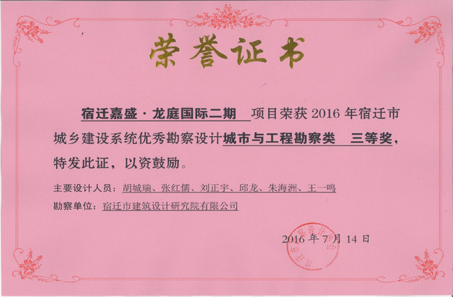2、宿遷嘉盛‘龍庭國(guó)際二期項(xiàng)目中獲城市與工程勘察類三等獎(jiǎng)